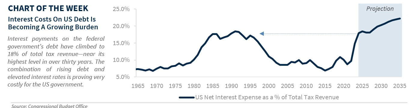 • Rising National Debt—The US national debt is climbing at an unsustainable pace—now over $37t and projected to hit $50t within the next decade. The combination of soaring debt and elevated interest rates is proving costly, with interest payments now the 2nd largest item in the federal budget, consuming 18% of total revenues in FY24—up from 11% in FY19. As pandemic-era debt issued at ultra-low rates gets refinanced at today’s higher levels, the average cost to service the debt has jumped to ~3.4%, up from just 1.5% in 2022. These mounting costs are a key reason why President Trump and the Treasury Dept. have been laser-focused on pushing interest rates lower.